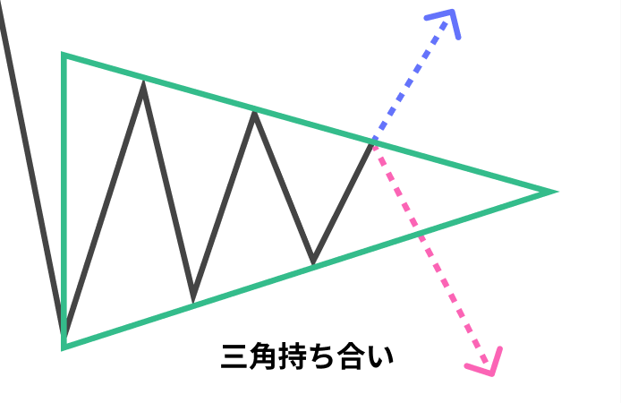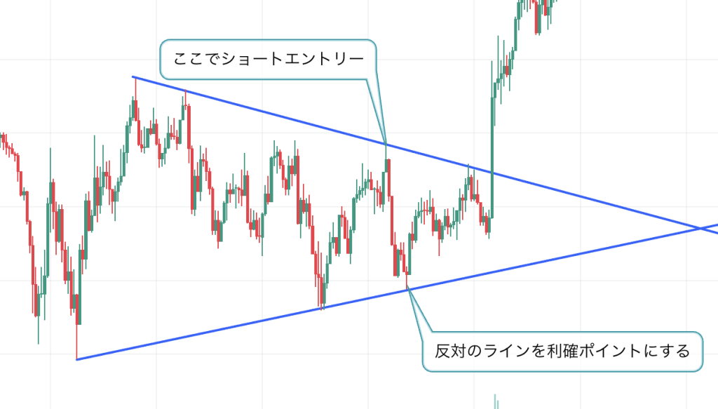 三角持ち合いの特徴として、直近の高値と高値、安値と安値を結んだラインで価格が反発します。