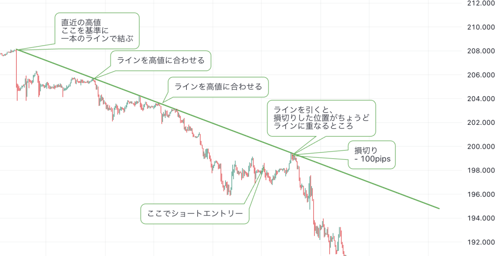そうして実際にラインを引いてみると実は損切りした位置がちょうどラインと重なる位置なんですよね。